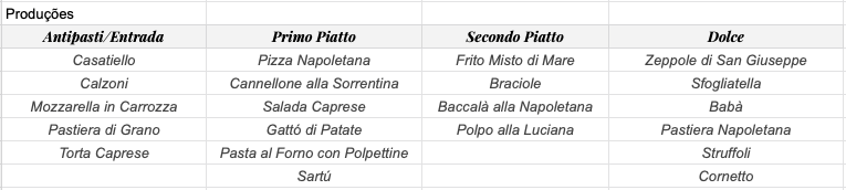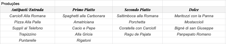Por exemplo, a melhor época de Carciofi (alcachofras) é de Novembro até Abril/Primavera, mesmo sendo disponível no ano todo.